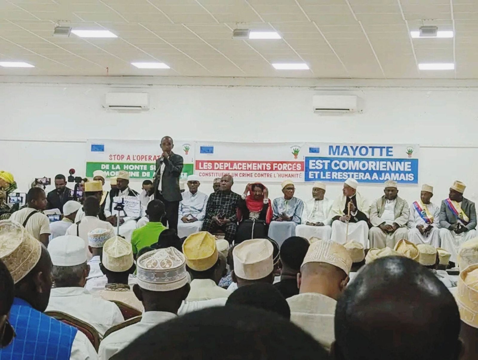Dernier à prendre la parole, le grand notable Ali Abdallah appelle la notabilité,  les oulémas à lever le petit doigt afin d’exprimer le ras-le-bol devant la France contre son projet à Mayotte. « Nous ne pouvons pas tolérer une énième humiliation de notre pays souverain en laissant  perpétrer un crime contre l’humanité sur nos terres. Oulémas, notables qui nous sommes, L’heure est venue pour défendre nos terres ou mourir en martyrs », lance-t-il.